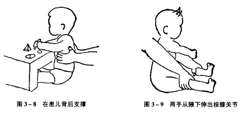 (4)当患儿全身肌张力低时,可在前面放置一张根据患儿坐高制作的一个小桌子,让他边玩边强化坐位姿势。如果肌张力很高,父母可以在患儿背后支持,尽量使髋关节前屈。膝关节同时有屈曲时,父母需用双手从患儿腋下伸出手来按压膝关节使双下肢伸直坐(图3-8、3- 9)。