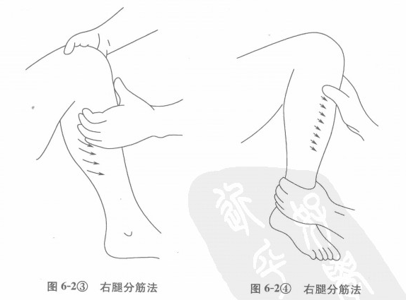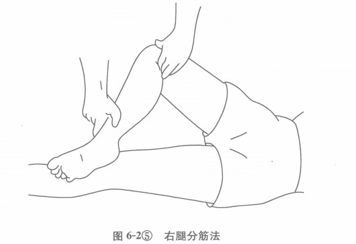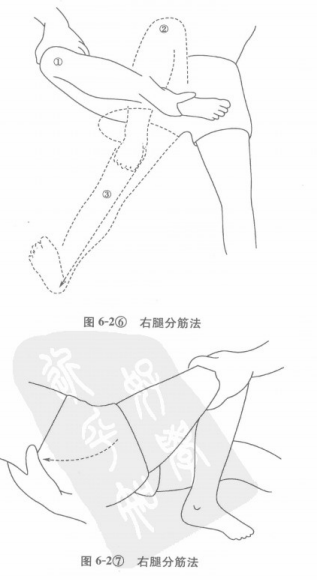 第5式:患儿右腿屈曲,医者用右手食指和中指扣住右腿弯内侧阴陵泉部位的筋,拇指扣住膝上。用左手拇指扣住右膝下髌骨上端,食指和中指扣委中部位的筋,向下缓缓拨动,揉送至承山部位止,做3~5次(图6-2③)。