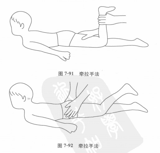 让患儿呈俯卧位,家长用一只手固定住其大腿,用另一只手握住患儿脚腕处,帮助患儿做腿的屈伸动作(图7-91)。