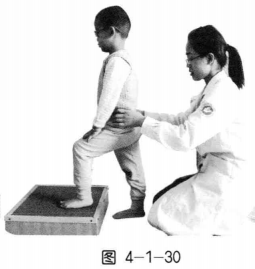 孩子直立位,治疗师双手控制其髋部,将其身体重心向一侧下肢偏移,引导孩子另一下肢抬起屈髋屈膝,将脚掌踩在台阶上,用相同的方法左右交替训练(图4-1-30)