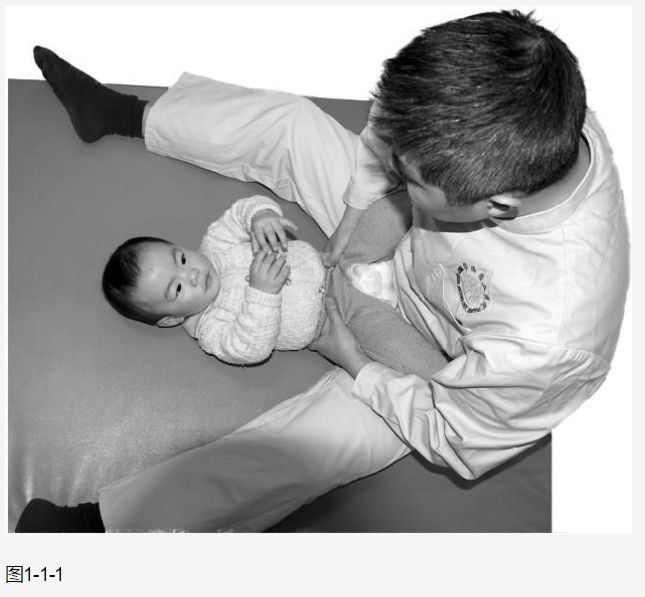 (1)治疗师长坐于治疗垫上,将婴幼儿仰卧放置在两腿之间,双手放在婴幼儿骨盆两侧,并将骨盆稍微抬起,向下牵拉(主要牵拉婴幼儿脊椎伸肌) ,将婴幼儿双腿放在治疗师的身上以保持牵拉的状态(图1-1-1 )。