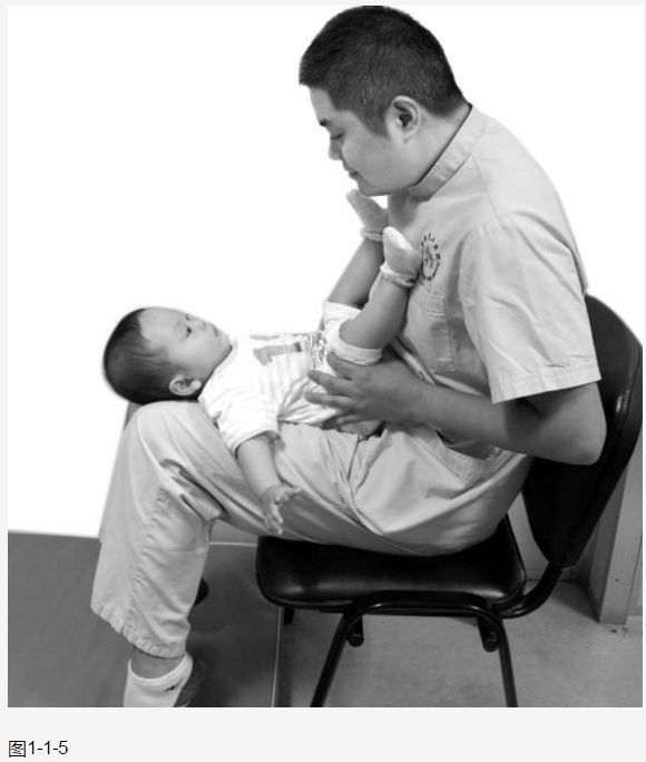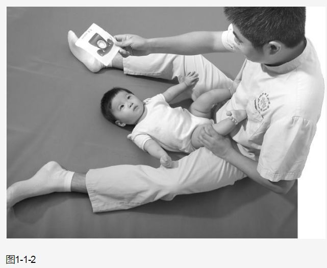 ( 5 )治疗师也可坐在地板或者椅子上,双髋屈曲至少至90°, 再将婴幼儿放在大腿上,使婴幼儿头和躯干平行于地板,而不向下倾斜。然后用玩具吸引婴幼儿视觉注意进行训练(图1-1-5 )。