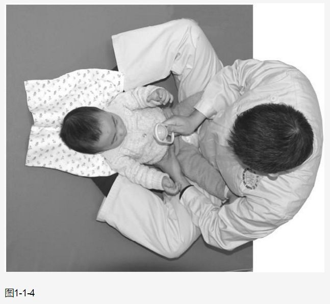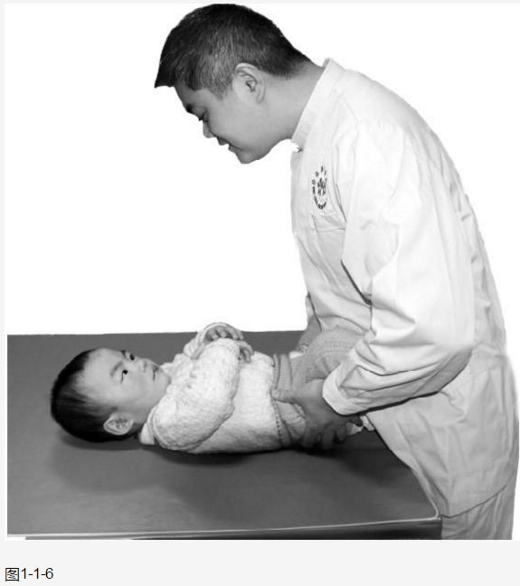 ( 6 )如果治疗师很难长坐于地板或者将婴幼儿放在腿上,可将婴幼儿放在治疗台上,站在一旁操作和训练(图1-1-6 )。