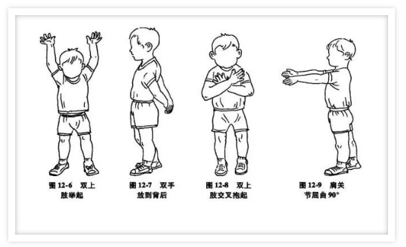 小手小手拍,拍,拍,请把小手举起来(先拍手,然后双上肢举起。双肩关节屈曲180度,肘关节,腕关节伸直,手张开)。