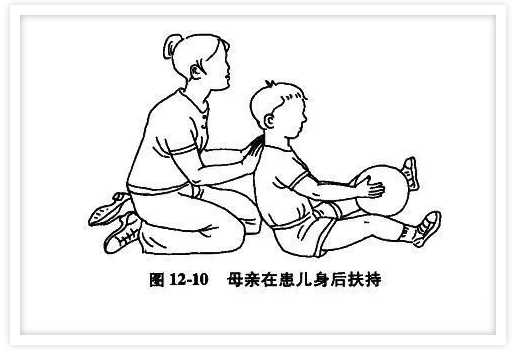 将患儿面对面坐两排,互相将球推向对方,看谁推的又准又快,父亲或母亲可坐在患儿身后扶持患儿。目的:可提高肩肘关节的屈伸运动及双手协调运动能力,改善患儿之间的交流沟通能力(图12-10)。