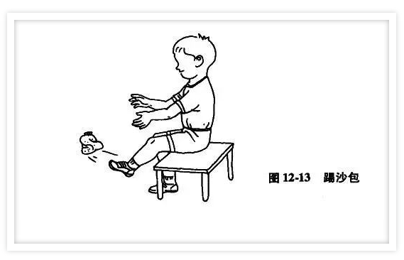 坐位用单脚踢出,远为胜。目的:提高脚,腿的抬起能力。增加股四头肌肌力(图12-13)