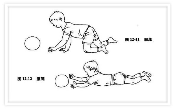 患儿俯卧位排成一排向前追球。可腹爬,四爬,高爬。目的:提高四爬,腹爬,高爬,三点支撑能力,可提高患儿树立信心,意志控制及解决问题的能力(图12-11,图12-12)。