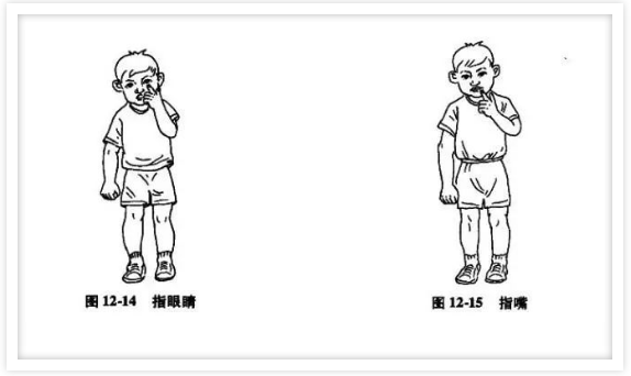 提示患儿以食指触摸自己的鼻子,耳朵,嘴巴,眼睛等部位,可左右分别进行。目的:提高上肢的关节活动范围,改善患儿对自身的认识及反应能力(图12-14,图12-15).