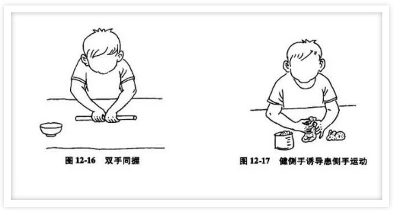 让患儿两手握住同一木棒,类似擀面一样去压橡皮泥或黏土,母亲或作业治疗师要给予协助,保持患儿姿势对称,防止患侧肩胛带的后退。此游戏可促进患侧的分离运动,通过反复的类似运动,可防止肌紧张的增强,同时用健侧手带动患侧手的运动(图12-16,图12-17).