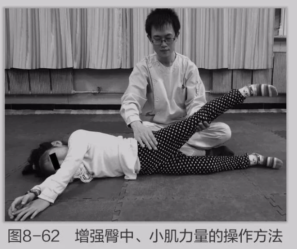 患儿侧卧位,治疗师在其后侧,一只手扶持患儿上方的骨盆,另一只手托起患儿上侧膝盖,向上方抬起伸展的下肢,使其外展,使臀中、小肌收缩(图8-62),尽可能使上抬的下肢维持在空中,可能的情况下让患儿自行上抬上侧下肢,治疗师可以给予必要的辅助。