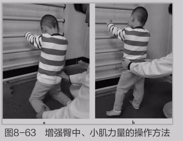 患儿膝立位,双手握持前方肋木,治疗师跪坐于其后方,一只手扶持患儿的一侧骨盆,另一只手握持患儿的另一侧小腿,令患儿向侧方迈出下肢(外展),如果患儿自己不能迈出,治疗师可以辅助下肢的外展(图8-63a)。也可以在立位上进行同样的操作(图8-63b)。