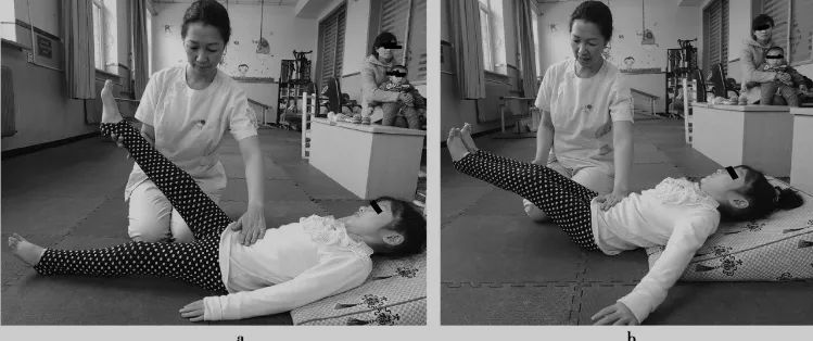 患儿仰卧位,治疗师坐于其体侧。口头吩咐患儿抬起一侧下肢,如果自己进行有困难,治疗师可以给予相应的协助,如果有可能,最好是将下肢举至与躯干呈直角的程度。应反复进行,需要两侧同时或者两侧交替进行(图5-73a)。也可以进行同时上举双侧下肢的训练(图5-73b)。