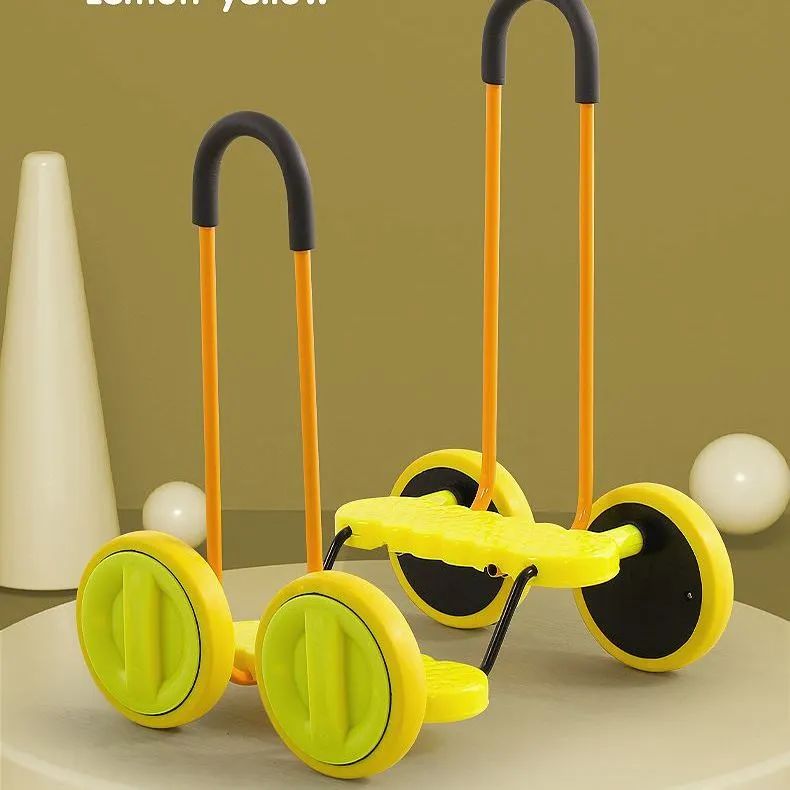 ③对于能力较差的老师可以提示,辅助,孩子脚放置于脚踏处前端,抬头、挺胸,老师站立于孩子身后,双手抓于孩子手放于两侧手把处,做左右前后交替向前运动。