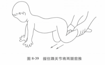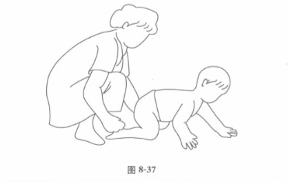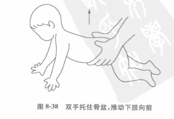 在孩子身后,双手托住骨盆部,一步一步地把下肢向前移动,或者双手握住患儿踝关节,将两腿向前推动,逐渐让患儿自己移动,促使其早日独立腹爬(图8-38,图8-39)。