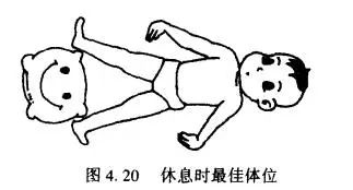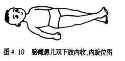 患儿在仰卧位时,双腿之间应摆放一枕头或其他质地柔软的物体,双脚尖也应尽量转向外侧, 如图4.20。