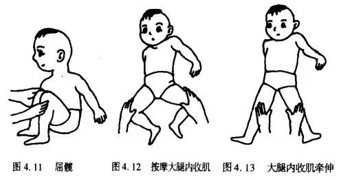 把患儿双膝左右慢慢分开,使之贴近床面如图4.12,维持2~3分钟,同时可按摩两侧大腿内侧,以放松紧张的内收肌。