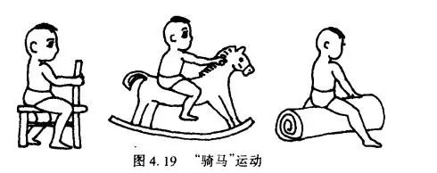让患儿骑在小摇马、滚筒、小椅子和被褥卷上玩耍或练习行走,如图4. 19,这样既增加了训练项目的趣味,又达到了训练髋关节外展的目的。