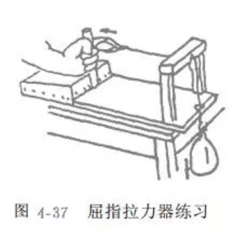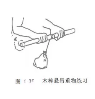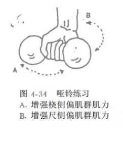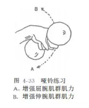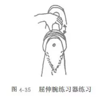 可用哑铃、腕屈伸练习器等。增强伸腕肌群肌力时,前臂旋前,手握哑铃或练习器的手柄,增强屈腕肌群肌力时,前臂旋后,手握哑铃或练习器手柄(图4_33、34、35)。也可以在一木棒中间挂一重物,双手握住木棒两端,练习屈、伸腕(图4_ 36).