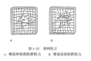 可用指拉力器增强屈指肌群肌力 (图 4-37) :用指网练伸指、屈指肌群肌力(图4-38);用健身圈、小橡胶球练习手内在肌群肌力。