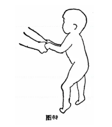 小儿由于肌张力增高,双脚尖负重。步行需别人帮助,臀部向后翘,四肢屈曲(图68)。