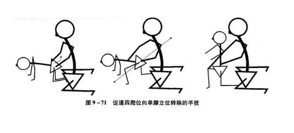 在患儿不能取正确的膝立位时,可以促通患儿从四爬位向单膝立位转换。