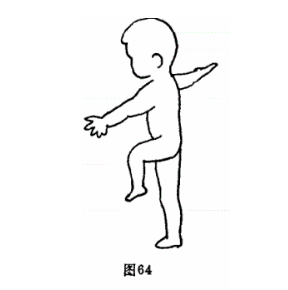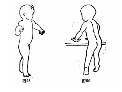 新生儿期可以出现立位反射,家长双手握住患儿双腋下,可见小儿双足踝关节有轻度屈曲,这是一种原始反射,但很快就会消失。随着运动发育及全身控制能力提高,12个月时孩子一般能够独自站立(图58)。