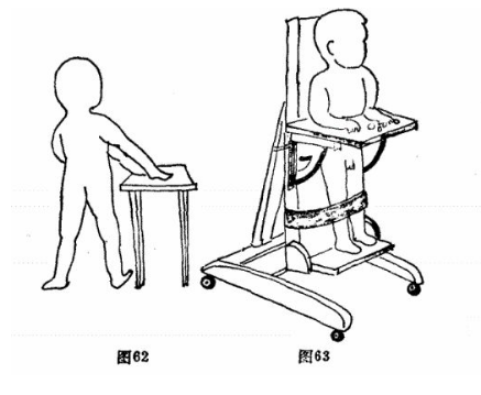 为了矫正异常立位姿势,可以利用家里的一些家具:如桌子或倾斜台、床档、成人椅背等,家具高度原则上以方便于立位时双肘伸直,腰伸直,有助站立训练为佳。