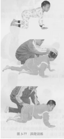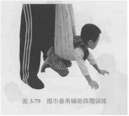 患儿取四爬位,以围巾或床单等悬吊于患儿腹部以减轻患儿负重,协助患儿完成爬行训练(图3-79)。