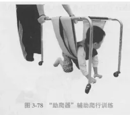 患儿俯爬于“助爬器”中,调整吊带至患儿刚好呈四爬位高度,借助于吊带减轻患儿负重,有利于患儿爬行(图3-78)。