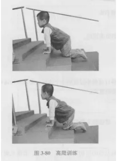 当患儿能在平地上自如四爬时,就可以进行爬楼梯训练,高爬训练要求患儿髋关节有良好的屈曲能力,同时也是患儿向直立位移行不可缺少的过渡阶段(图3-80)。
