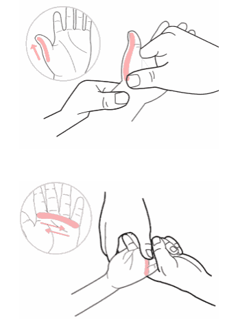 训练员用手指在患者的手掌上搓,接着平推伸指穴(由上往下),也可沿患儿的手指、前臂。