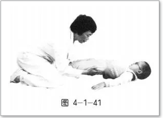 (2)孩子仰卧,双下肢伸展,治疗师辅助其背腰抬离地面,使髋伸展【图4-1-41】。