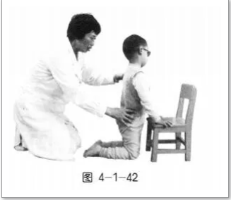 (3)孩子膝立位,治疗师扶持其髋部使髋伸展,大腿和躯干保持直立位【图4-1-42】。