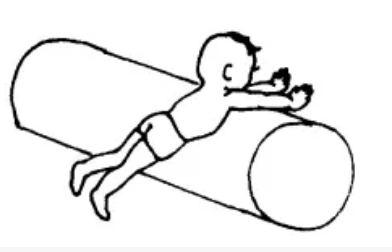 (4)患儿俯卧于滚筒上,一手支撑于地面上,并在支撑臂的肩部施以适当的压力,另一手从事某一作业活动。