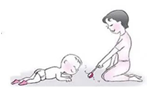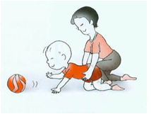 04爬行训练①前臂支撑控制训练 孩子取俯卧位,家长轻坐与孩子骨盆处,双上肢对孩子双上肢进行有效控制,使孩子双上肢负重。②四点支撑控制训练及爬行训练 孩子取俯卧位,家长位于孩子下方,使孩子屈髋屈膝90°,双上肢对孩子双上肢进行有效控制,使其手膝同时负重。对于能够四点支撑,能力相对好的孩子,家长可扶住孩子膝部,左右交替向前推进。