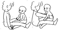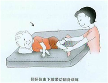 03坐位训练孩子呈仰卧位,双腿分开,家长面向孩子坐于其双腿中间,双腿轻压在孩子膝关节上,使其伸展,髋关节做外展动作,家长将其拉至坐位,使头及躯干保持在正中位。